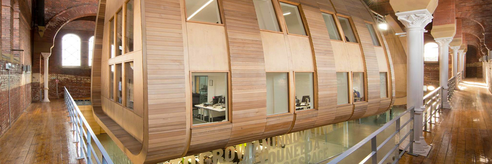 Standing empty for over 40 years, Tameside MBC and Oxford Innovation stepped in with a new vision for the remarkable space. In 2014, work began to transform the iconic landmark into a vibrant and thriving digital hub with workspace for businesses in the surrounding Greater Manchester area. With an impressive new timber structure built at the heart of the building’s original walls, we continued the Baths’ history of reinvention, innovation and creativity. This is the Ashton Old Baths we know today.
